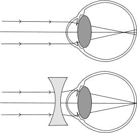 En la imagen se observa un ojo con miopía, de forma que la imagen se proyecta por delante de la retina y en la imagen inferior se observa el efecto óptico de un cristal divergente, que desplaza la imagen hacia la retina, permitiendo que se vea nítida.